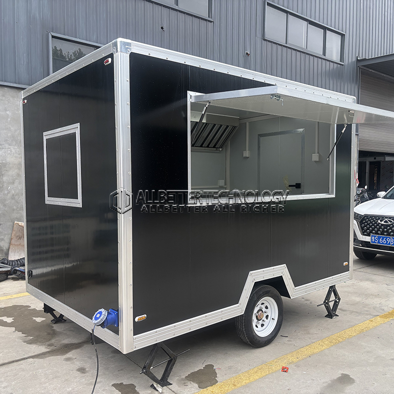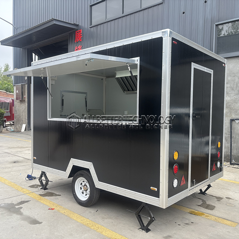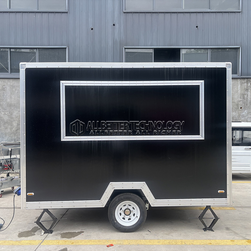 The 10ft black square food trailer boasts a stylish black exterior with aluminum trim, giving it a professional and polished appearance. Its square design maximizes interior space, allowing for a well-organized and functional kitchen setup. The trailer is built on a sturdy chassis, ensuring durability and reliability on the road. With its large serving window and easy-access door, this trailer is designed for efficient customer service and operator convenience.