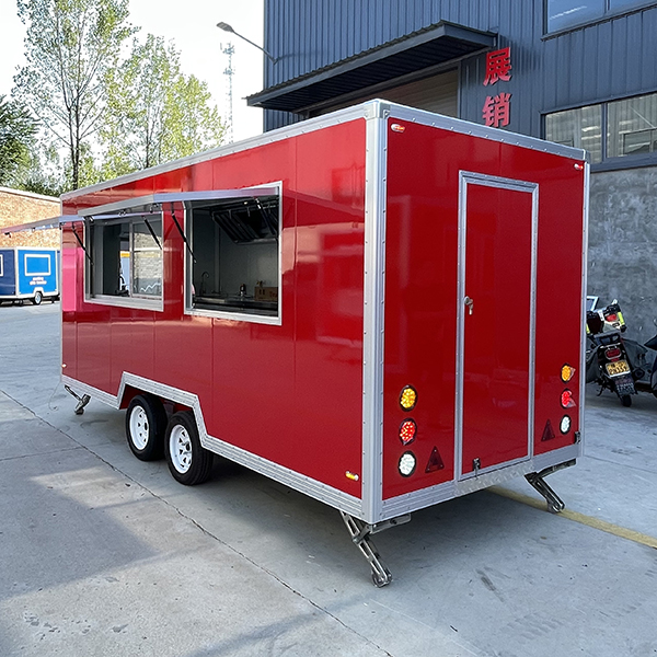 The 15ft red double windows square food trailer is a mobile catering trailer-style food truck, approximately 4.57 meters long. Its square body with a dual-axle chassis ensures stable load-bearing capacity and is compatible with pickup trucks and SUVs for towing. The main body is a high-saturation red with silver metallic trim. Dual hydraulically opened service windows can be folded into awnings. It features lockable doors at the rear and sides, along with safety warning lights and reflective markings. Adjustable support legs are located at the bottom, and the towing head has pre-installed water and electricity interfaces. Balancing mobility and safety compliance, it is suitable for street scenes, events, and other scenarios.