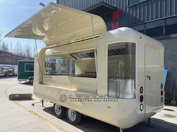 The 15ft white flying wing cloud warehouse food trailer takes “cloud mobile warehouse” as its core design inspiration. The overall design features a creamy white main color and rounded cloud lines, with the signature gull-wing lift-up roof. When opened on both sides, it forms a sunshade about 2 meters wide, which not only expands the operating space, but also becomes a “visual center” on the street, perfectly meeting the US market’s consumer demand for “Instagrammable + transparent kitchen”.